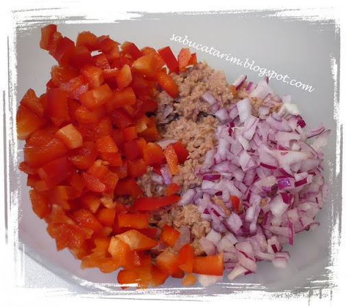 Tocaţi ceapa şi ardeiul gras fin-fin-fin. Amestecaţi-le cu tonul într-un castron.