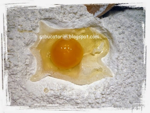 Spargeţi un ou taman în mijlocu’ făinii şi amestecaţi bine-bine, cu mâna. După ce se încorporează bine oul, începeţi să adăugaţi apa călduţă, frământând cu simţ de răspundere.