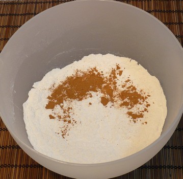 Amestecaţi într-un bol făina, praful de copt, scorţişoara, sarea şi zahărul brun.