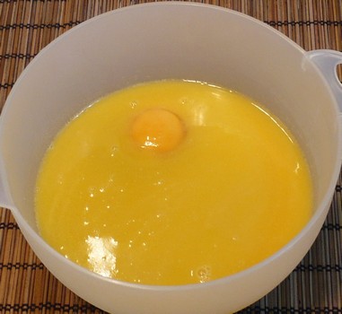 Adăugaţi oul, untul topit, laptele şi esenţa de vanilie. Amestecaţi-le bine pe toate.