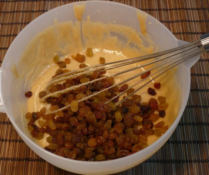 Apoi adăugaţi stafidele şi mai amestecaţi cât să se încorporeze bine.
