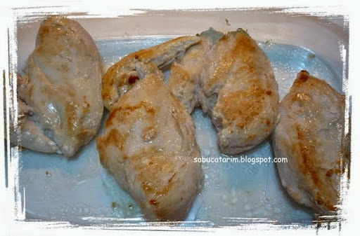 Prăjiţi în ulei bucăţile de piept de pui pe ambele părţi doar cât să se coloreze la suprafaţă şi puneţi-le într-un vas termorezistent.