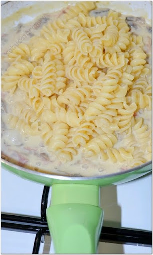 Puneți pastele fierte, amestecați bine și luați-le de pe foc.